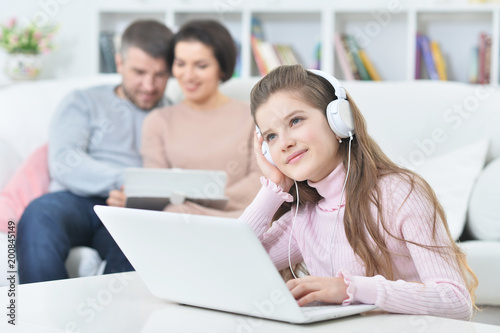Happy girl sitting at table with laptop with her parents on bac