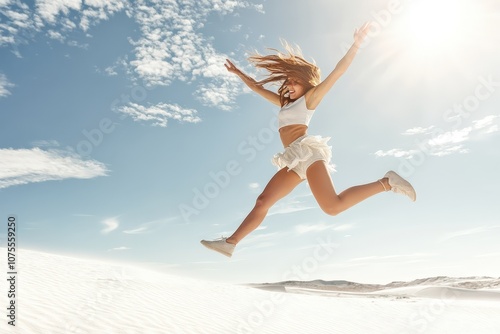 Happy girl jumping with her mouth open and her tongue hanging out. A 6-7 year old child enjoys a carefree childhood. Beautiful simple AI generated image