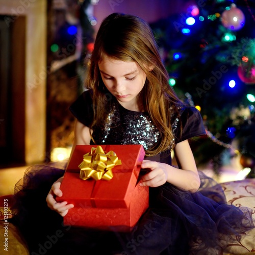Happy girl opening Christmas gifts by a fireplace