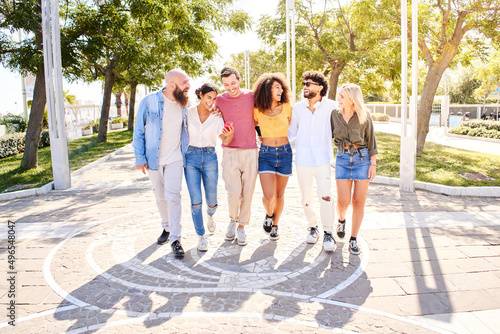 Happy group of smiling friends walk outdoors enjoying the summer holidays and having fun together