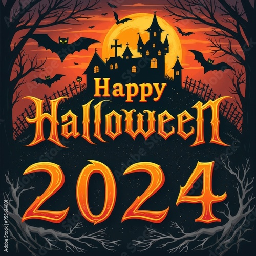 Happy Halloween 2024 Greeting Card with Haunted Mansion and Bats