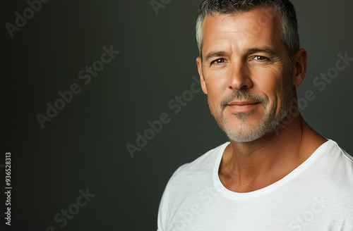 happy, handsome, athletic middle-aged man wearing a white t-shirt