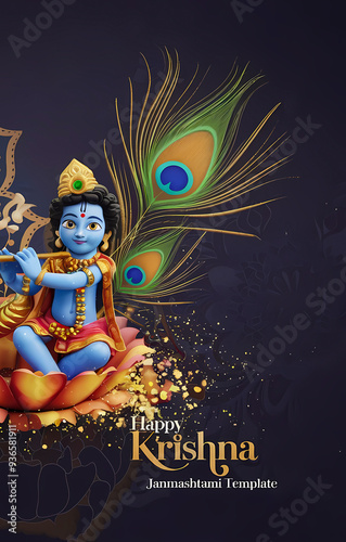 Happy Krishna Janmashtami greeting card template, seamless peacock feather pattern, Indian festival celebration, graphic design illustration wallpaper