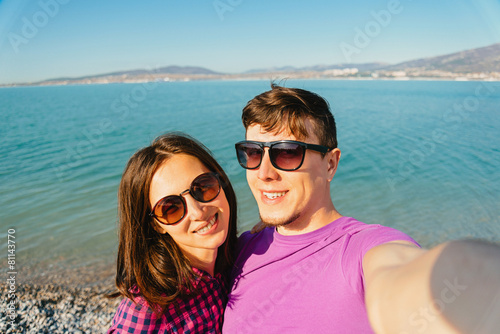 Happy loving couple taking self-portrait on beach