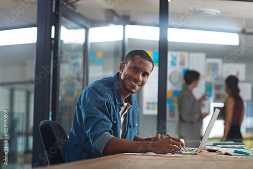 Happy man, portrait and laptop in office for research, business procedure and creative feedback. Entrepreneur, computer and notes in startup agency for project management, website design or planning