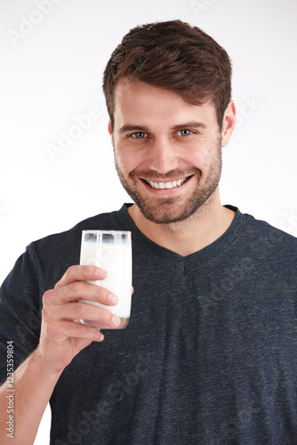 Happy man, portrait and milk with glass for calcium, vitamin D or nutrition on a white studio background. Face, male person or healthy model with smile for dairy drink, strong bones or potassium