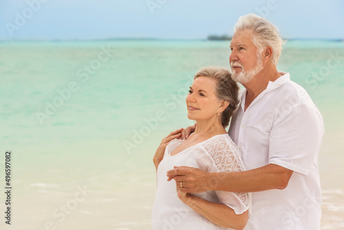 Happy mature Caucasian couple outdoors together on tropical beach