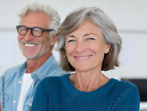 Happy mature couple portrait, smiling. Positive, casual lifestyle image, perfect for insurance, financial planning, or retirement themes. Warm and authentic.