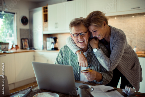 Happy mature couple using credit card on laptop at home