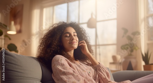 Happy millennial Hispanic woman sit in cozy chair in design home stretch relax breathe fresh air. Smiling young female renter or tenant rest in armchair relieve negative emotions enjoying weekend.