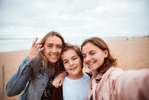 Happy mother and children walking on the beach together on vacation