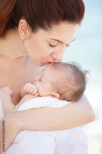Happy mother kissing her cute sleeping baby. Motherhood and chil