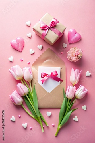 Happy Mother's Day gift concept. Top view flat lay of pretty pink present boxes with ribbon, tulip flowers, paper hearts on a soft pastel violet background with empty circle for text