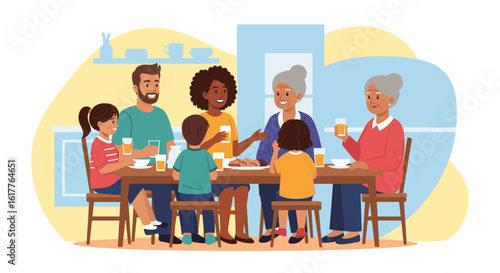 Happy multigenerational family enjoying a meal together, perfect for family, togetherness, and food-related marketing materials.