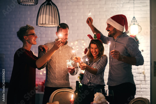 Happy new year ! Happy group of friends celebrating new year together. Holding sprayers in their hands and dancing.