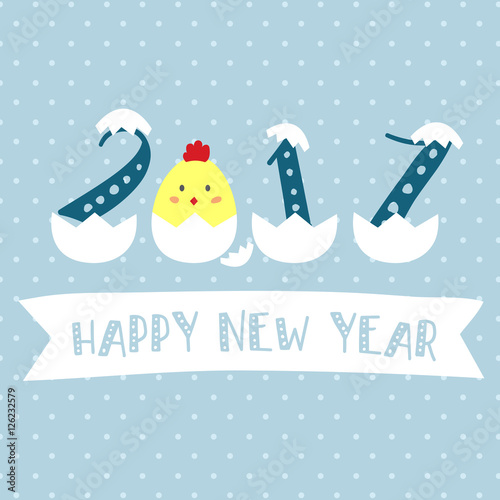 Happy New Year 2017 theme. Year of Rooster. Happy cute chick chicken egg cartoon character design. Season's greetings. Vector Illustration.