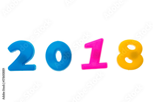Happy New Year 2018 of real colorful magnet figures numbers isolated on white