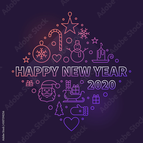Happy New Year 2020 concept thin line vector colored illustration on dark background