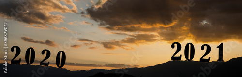 Happy New year 2021 letters on the mountain with sunset light, Silhouette of year 2021 with sunrise on mountain for New year success, Starting of New year concept.