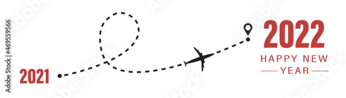 Happy new year 2022. 2022 number design template . Airplane route line the way from 2021 to 2022. Abstract airplane flying. Vector illustration
