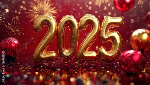 Happy New Year 2025! Celebrate the upcoming year with joy and excitement. Golden balloons, fireworks, and confetti create a festive atmosphere, symbolizing hope and new beginnings.