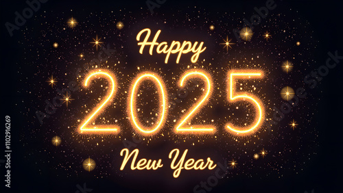 Happy New Year 2025 Golden Neon Lights. Concept of celebration, holiday, and party.