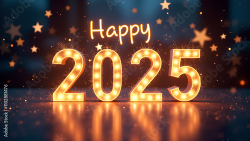 Happy New Year 2025 with glowing lights. Concept of celebration, holiday, and future.