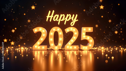 Happy New Year 2025 with golden lights. Concept of celebration, holiday, and future.