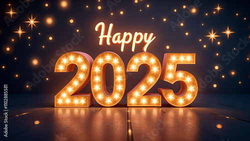 Happy New Year 2025 with illuminated numbers. Festive celebration concept.