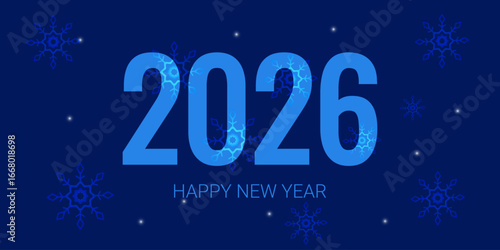 Happy new year 2026 banner with text 2026, snowflakes on blue background. Horizontal template. Vector.