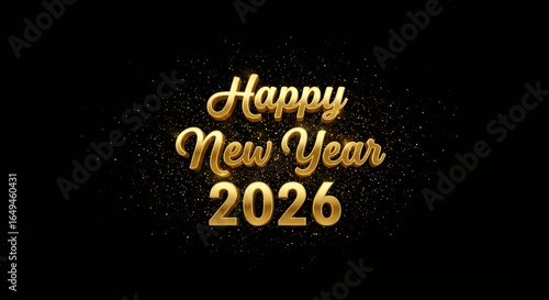 Happy New Year 2026 elegant gold 3D text with sparkling glitter particles on black background for celebration greeting card