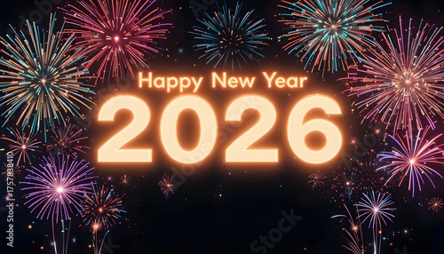 happy new year 2026 glowing typography with colorful fireworks celebration background