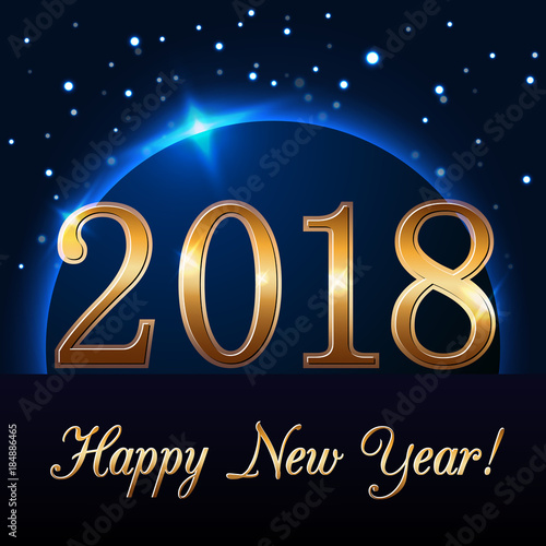Happy New Year background with magic gold rain and globe. Golden numbers 2018 on horizon. Christmas planet design light, glow and sparkle. Symbol of wish, celebration Vector illustration
