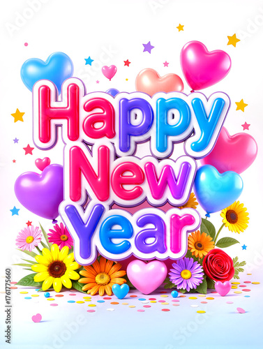 Happy new year greeting design with vibrant colorful 3D surrounded by heart shaped ballons and bright flowers in cheerful composition.