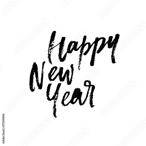 Happy New Year or Christmas greeting card calligraphy hand drawn vector paint brush font lettering on white background. Merry Christmas of New Year holiday party postcard text modern calligraphic