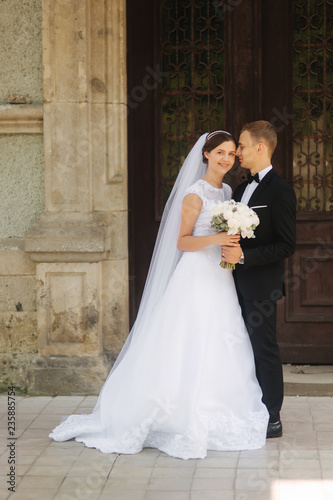 Happy newlyweds spend time together in their wedding day. Groom and bride