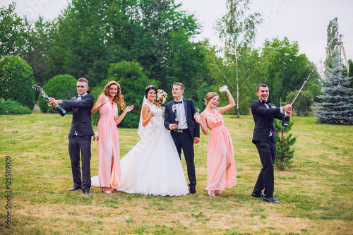 Happy newlyweds with their friends outdoor. Bride and groom with bridesmaids and groomsman walking with smoke bombs in the park. Text place. Copy space. Popping champagne, hilarious moment.