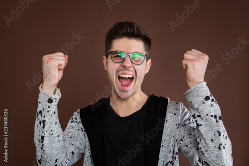 Happy positive excited young man clenching fists and screaming, wearing casual t-shirt glad to hear good news, celebrating his victory or success. Life achievement, goals and happiness concept.