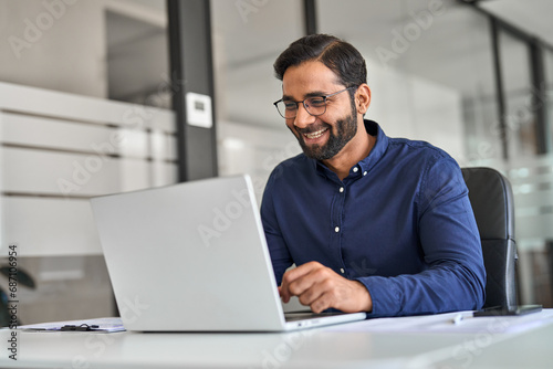Happy professional Indian business man company employee, male worker, manager or financial analyst smiling looking at computer satisfied with work results and profit growth sitting at office desk.