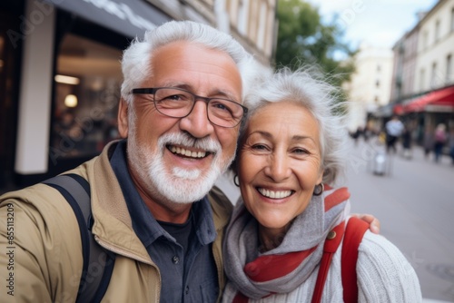 Happy senior couple taking a selfie on a winter vacation