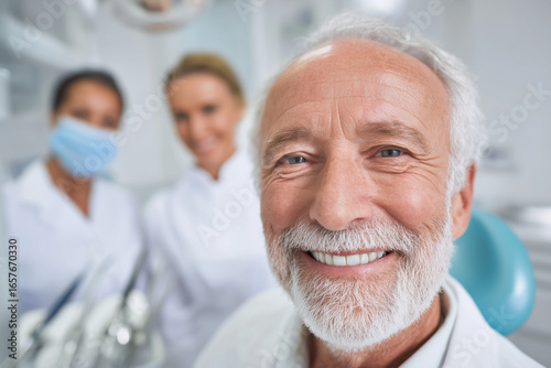 Happy senior man with healthy smile at dental clinic with professional dentists in background