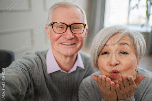 Happy senior woman man talk on video call with friends family. Mature old grandmother grandfather talking speaking with grown up children online. Older generation modern tech usage. Webcamera view