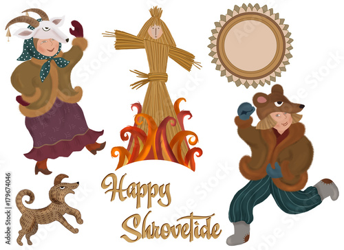Happy Shrovetide. Carnival celebration. People dressed in folk costumes celebrate the holiday cheerfully