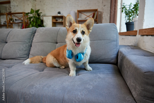 Happy, smiling, beautiful purebred corgi dog sitting on sofa in modern living room on daytime. Dog wearing headphones. Concept of animal life, care, pet friend, lifestyle, happiness, vet
