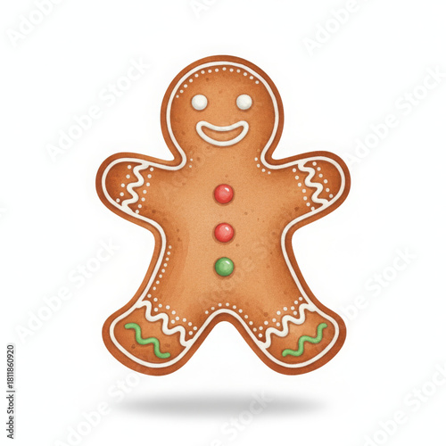 Happy smiling gingerbread man cookie, adorned with white icing and vibrant colorful buttons, creates delightful festive holiday atmosphere. classic baked sweet dessert treat