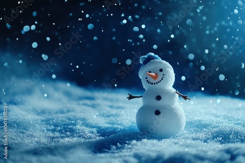 Happy snowman standing in blue winter christmas snow background. Merry christmas and happy new year greeting card with copy-space