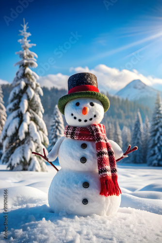 happy snowman standing in winter Christmas landscape