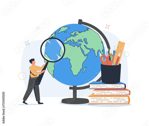 Happy student, learner and Earth globe. Global international education, studying foreign languages, learning abroad