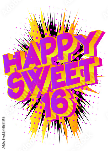 Happy Sweet Sixteen text on comic book background. Retro pop art comic style social media post, motion poster for the 16th birthday.