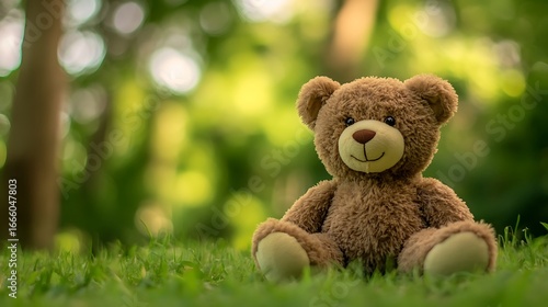 Happy teddy bear sitting on grass in a sunny park with nature background.